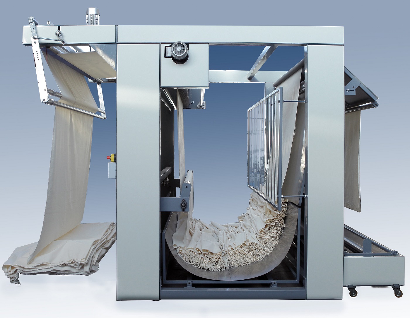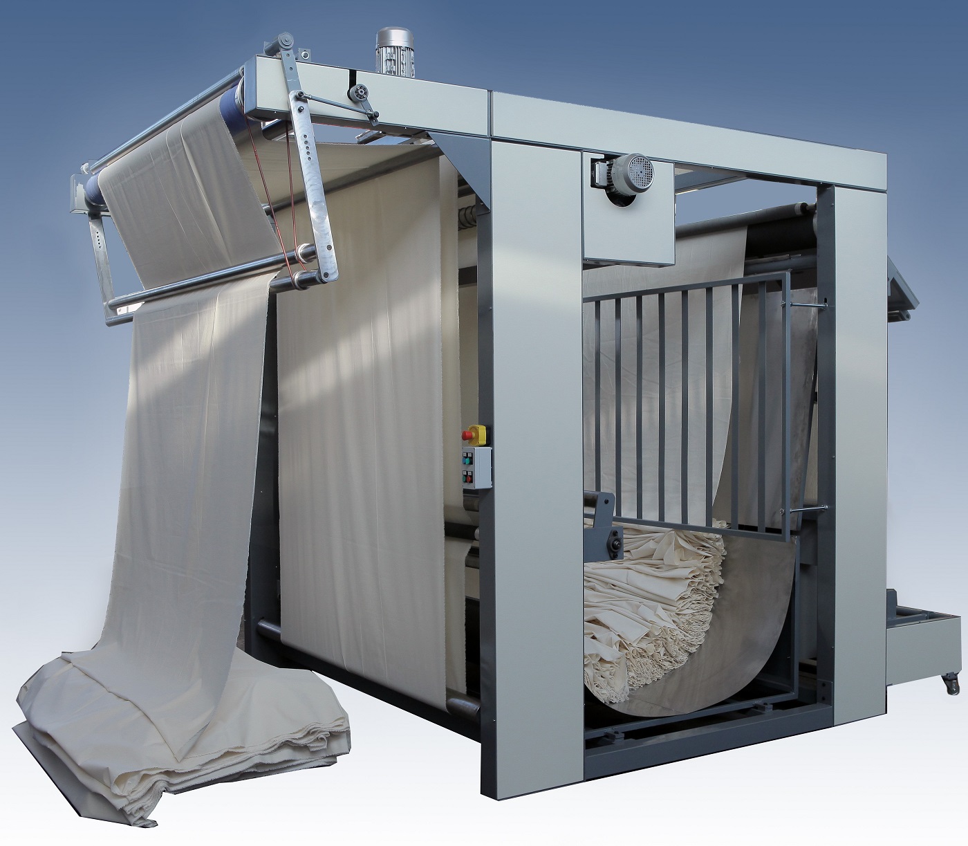 - Useful height of the fabric to be folded 2100 mm;- Unwinding of the rolls on an unwinding unit equipped with idle cylinder with variable fabric advancment speed from 0 to 120 MT/minute;- Accumulation of the fabric unwrapped on a steel j-box with fabric retaining walls;- Stretching of the fabric using a spreading unit equipped with spiral motorized cylinders;- Fabric centering obtained by means of a pneumatic centering device controlled by fabric alignment photocells;- Fabric folding using a folding unit with the possibility of insetring the stand function;- Fabric end photocell with automatic return for sewing fabrics;- Fabric measurement obtained by encoder located on the pulling cylinder and displayed on a monitor.