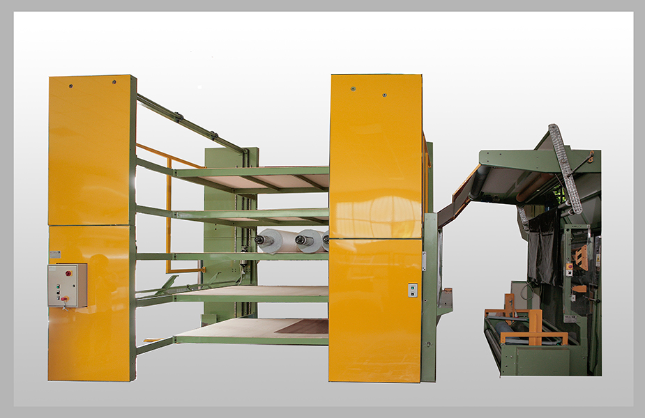 Possibilità di scegliere la struttura a tre o a cinque postazioni.Carico dei rotoli tramite elevatore elettrico comandato a pulsanti con possibilità di scegliere le postazioni desiderate di scarico.Immagazzinamento dei rotoli di tessuto sui ripiani in ferro tubolare ricoperti in legno.Scarico ottenuto tramite pulsanti elettrici i quali posizionano il gruppo svolgitore nella posizione stabilita.Il rotolo viene scaricato manualmente dall'operatore sul gruppo svolgitore per controllare il tessuto sulla macchina verificatrice.