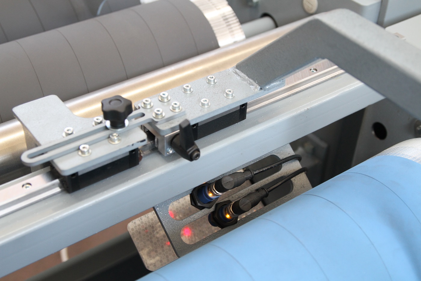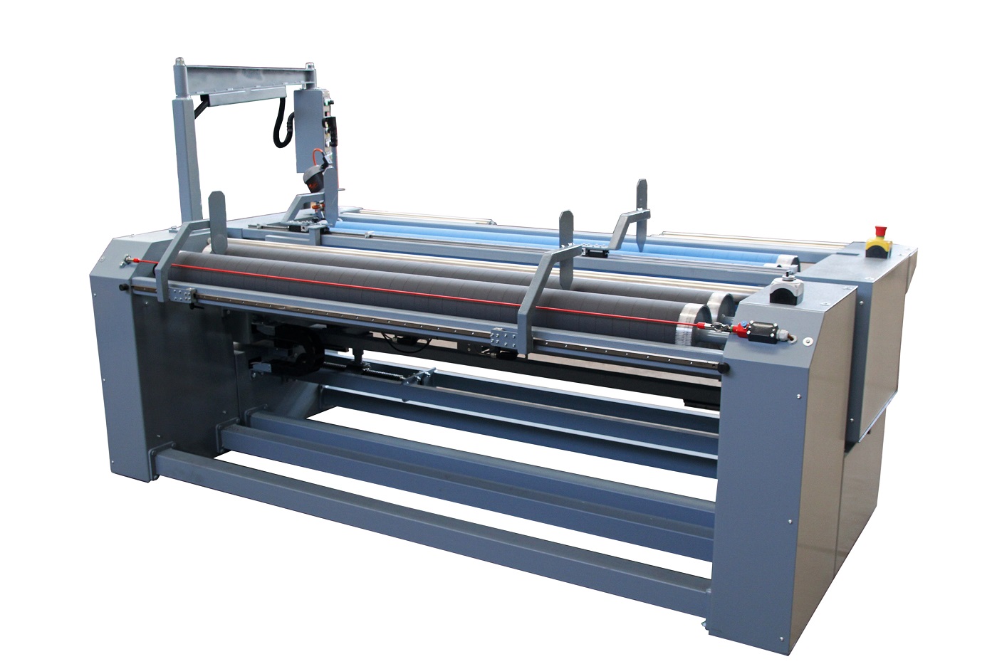 Arrotolatore da rotolo a rotolo con allineamento automatico del rotolo di tessuto tramite fotocellule elettriche.